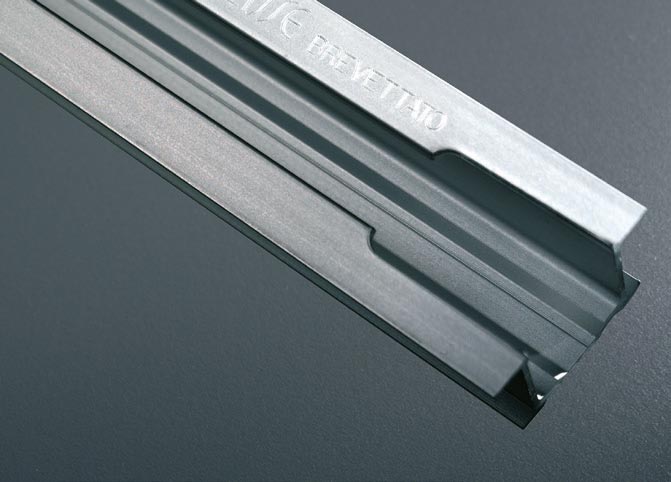 Der eingeprägte Meterriss. Der Meterriss ist auf dem Anschlagprofil eingeprägt, damit die korrekte Einbauhöhe auf der Baustelle gegeben ist.